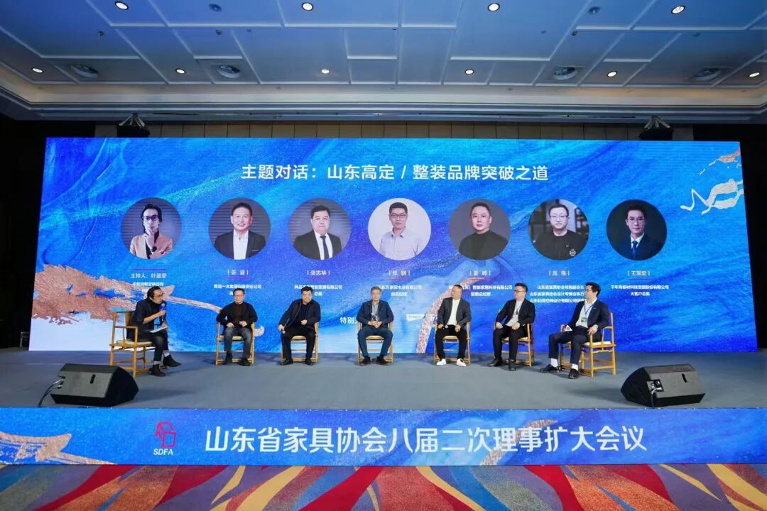 主题对话环节,青岛一木集团有限责任公司执行总裁姜波;尚品本色智能家居有限公司总裁张志华;山东万家园木业有限公司副总张钢;观兰(江苏)智能家居科技有限公司营销总经理姜峰;千年舟新材科技集团股份有限公司大客户总监王军宏;山东省家具协会常务副会长/设专委执行会长高伟围绕 “山东高定,整装品牌突破之道”展开讨论,对话由中智战略营销咨询创始人叶晟荣主持,现场围绕高定整装产业的核心发展命题深入交流,既探讨了传统实木企业、木门企业向整装转型的可行路径,也聚焦产品规模化生产与个性化需求的平衡之道,强调全屋定制需重视材质工艺的统一与稳步推进的发展节奏。同时,与会嘉宾还就高定品牌的价值塑造路径、材料端如何通过国潮花色创新与数码涂装技术为产业赋能,以及行业全案设计师培养的重要性与设计师渠道的深度打通等关键议题交换见解,最终凝聚起多方共识,为山东高定整装产业的协同突破提供了多元思路。